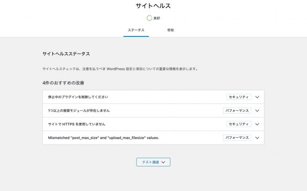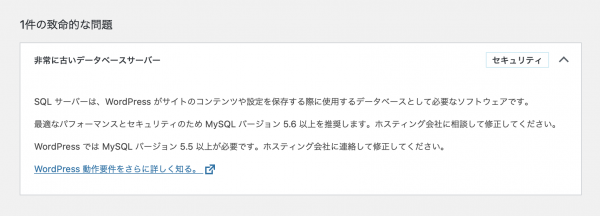 WordPressのバージョン5.4くらいから「サイトヘルス」という機能が追加されていたらしい(長いこと放ったらかしだったので認識できてない)。ダッシュボード上に下記のような「サイトヘルスステータス」ってのを表示してくれて、問題点や改善すべき点などを指摘してくれる。そこで「致命的な問題」として指摘されたのが、