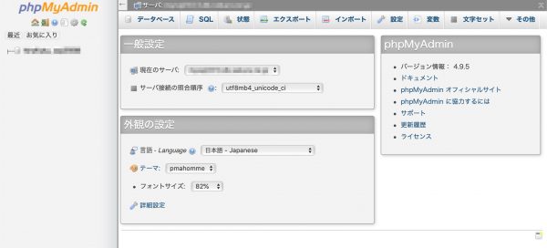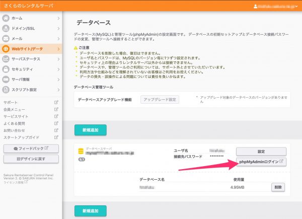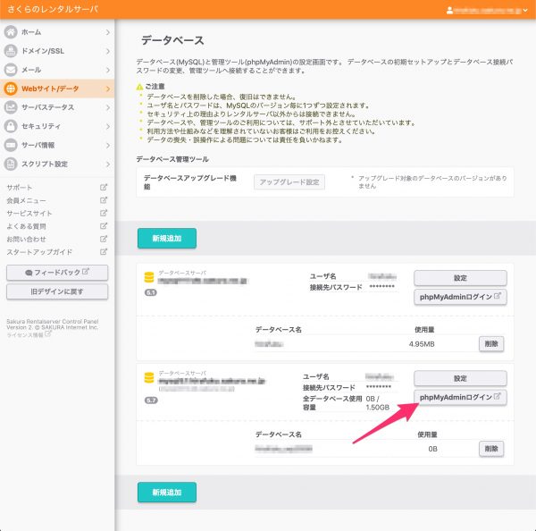 新しく追加されたデータベースサーバの「phpMyAdminログイン」ボタンを押す。