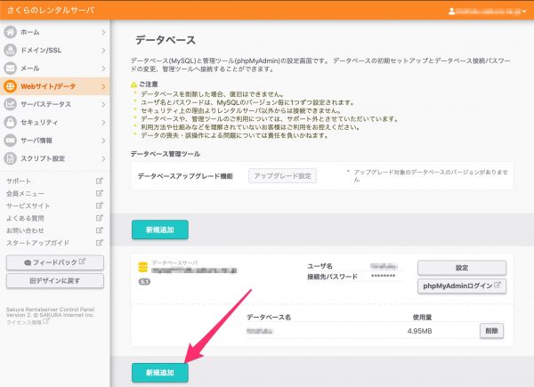 次に、新しいデータベースを作成する。先程のコントロールパネルの「データベース」から「新規追加」ボタンをクリック。