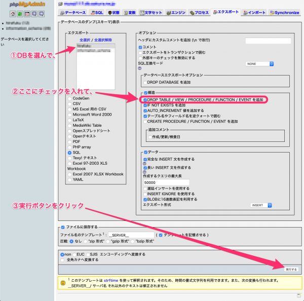 2. 構造の「DROP TABLE / VIEW / PROCEDURE / FUNCTION / EVENT を追加」のチェックを入れ、