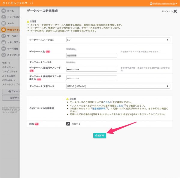 「データベース名」と「データベース接続用パスワード」を入力し、