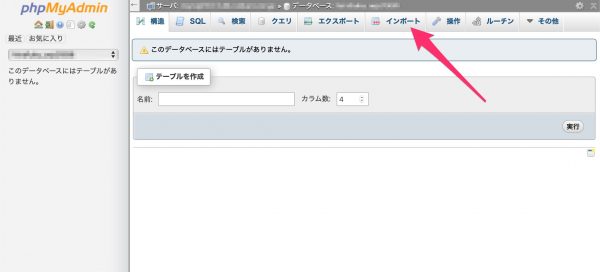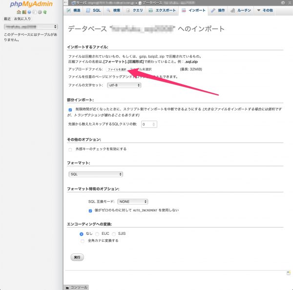 「インポートファイル」欄内のアップロードファイル「ファイルを選択」ボタンをクリック、パソコン内の先程修正したSQLファイルを選択しアップロード。