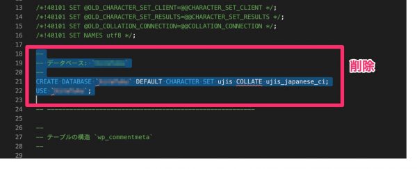 ここで、ダウンロードされたSQLファイルの中身を若干修正する必要あり。