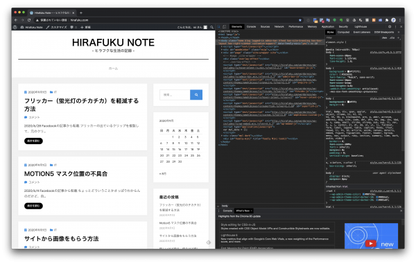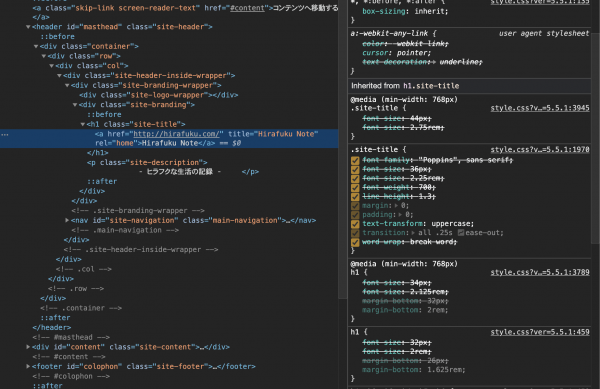 上の画面は、 Chrome の「表示」メニュー「開発 / 管理」から「要素の検証」に入ったところ。このモードでは、マウスカーソルを載せた要素の、ソース上の該当箇所を教えてくれる(反対にソースから要素の場所を知ることもできる)。コレを使い、まずはサイトタイトル「HIRAFUKU NOTE」を表示しているソースの位置を知り、関連のありそうな要素名を調べることで、犯人の目星をつける。