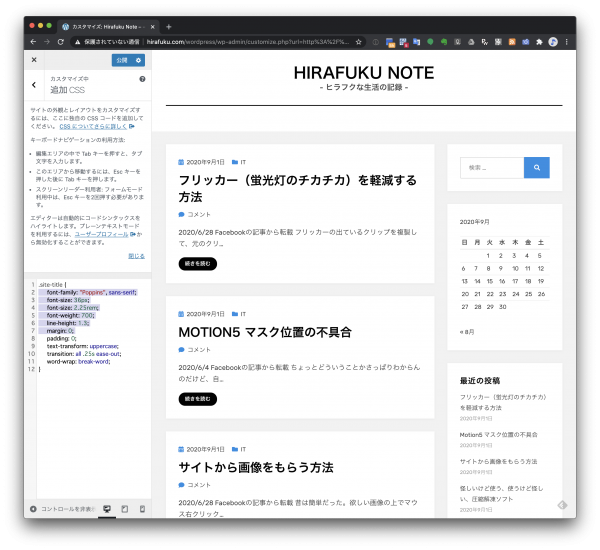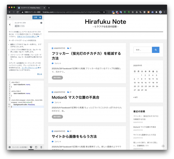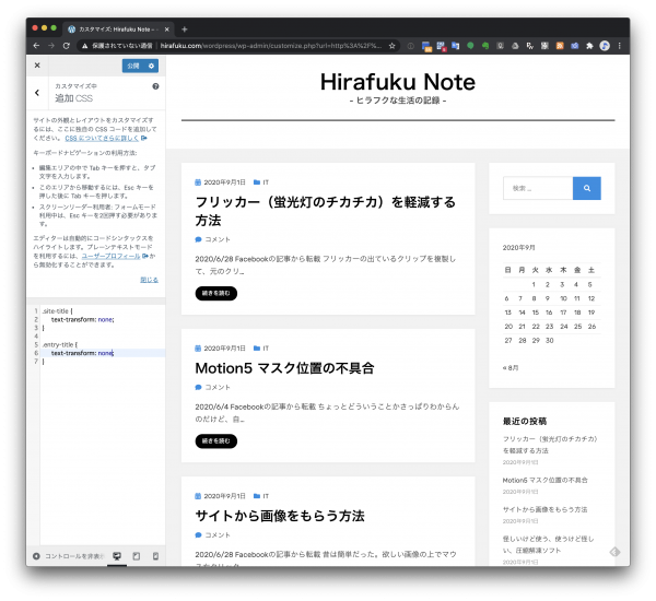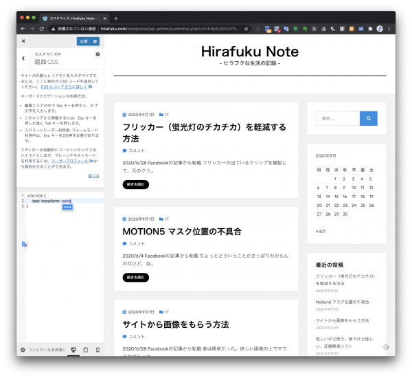 気に入ってコレにしたんだけど、気に入らない部分もチラホラ。例えば、サイトのタイトル「Hirafuku Note」が勝手に全部大文字になってる。それは投稿のタイトルも同様で「Motion」がすべて大文字になってる。まずはコレを何とかしたい。