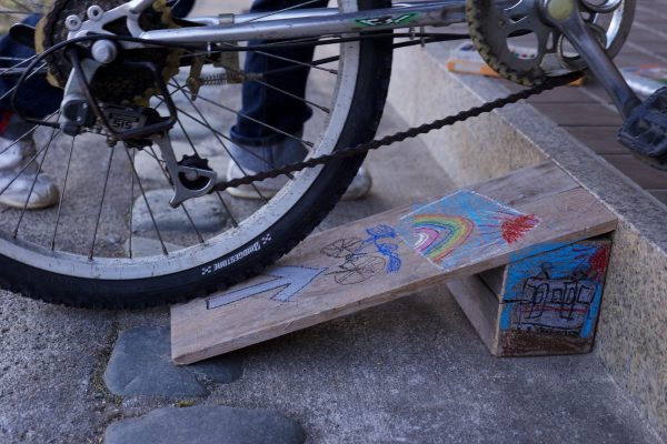 自転車を仕舞うとき、 玄関前の段差を持ち上げるのにいつも苦労していたので、端材でスロープを作ってやりました。 たいそう気に入ったらしく、完成したスロープを早速試したあと、クレヨンで絵を描いてました。 右側面にはいつもの電車。 上面には虹の写... -